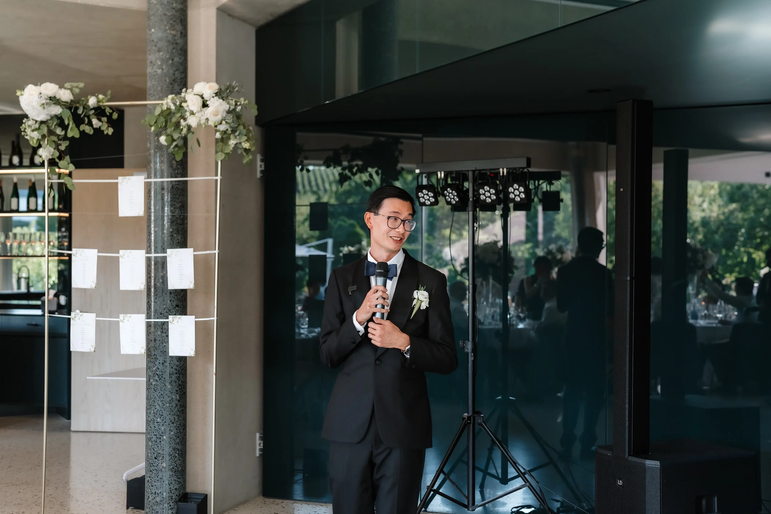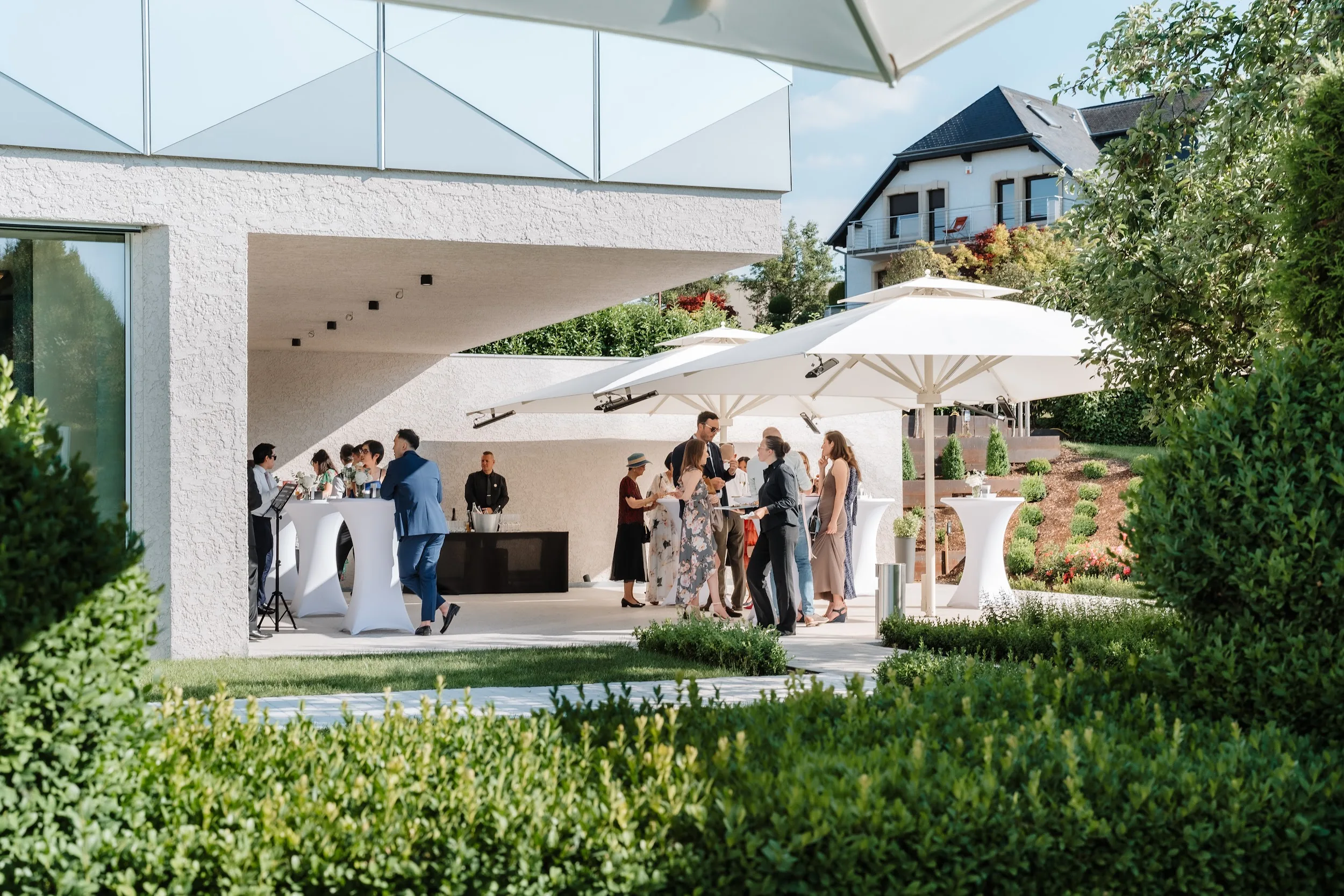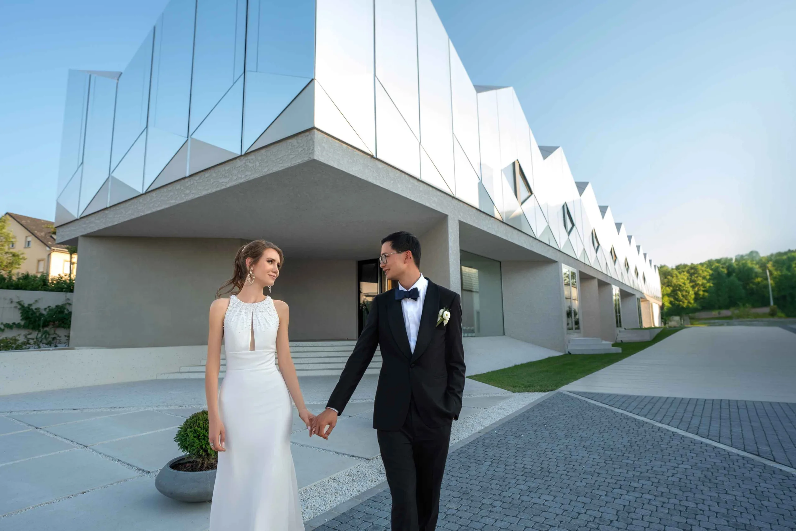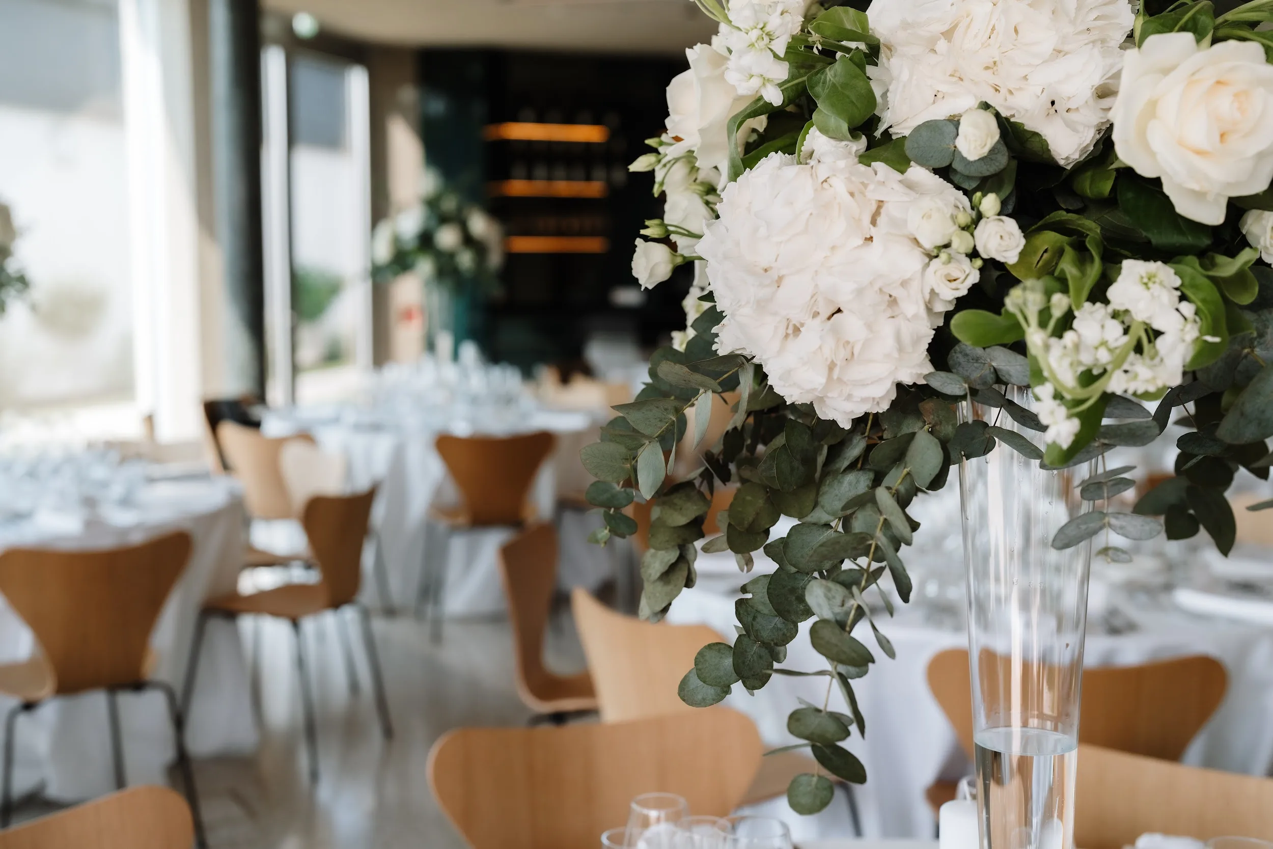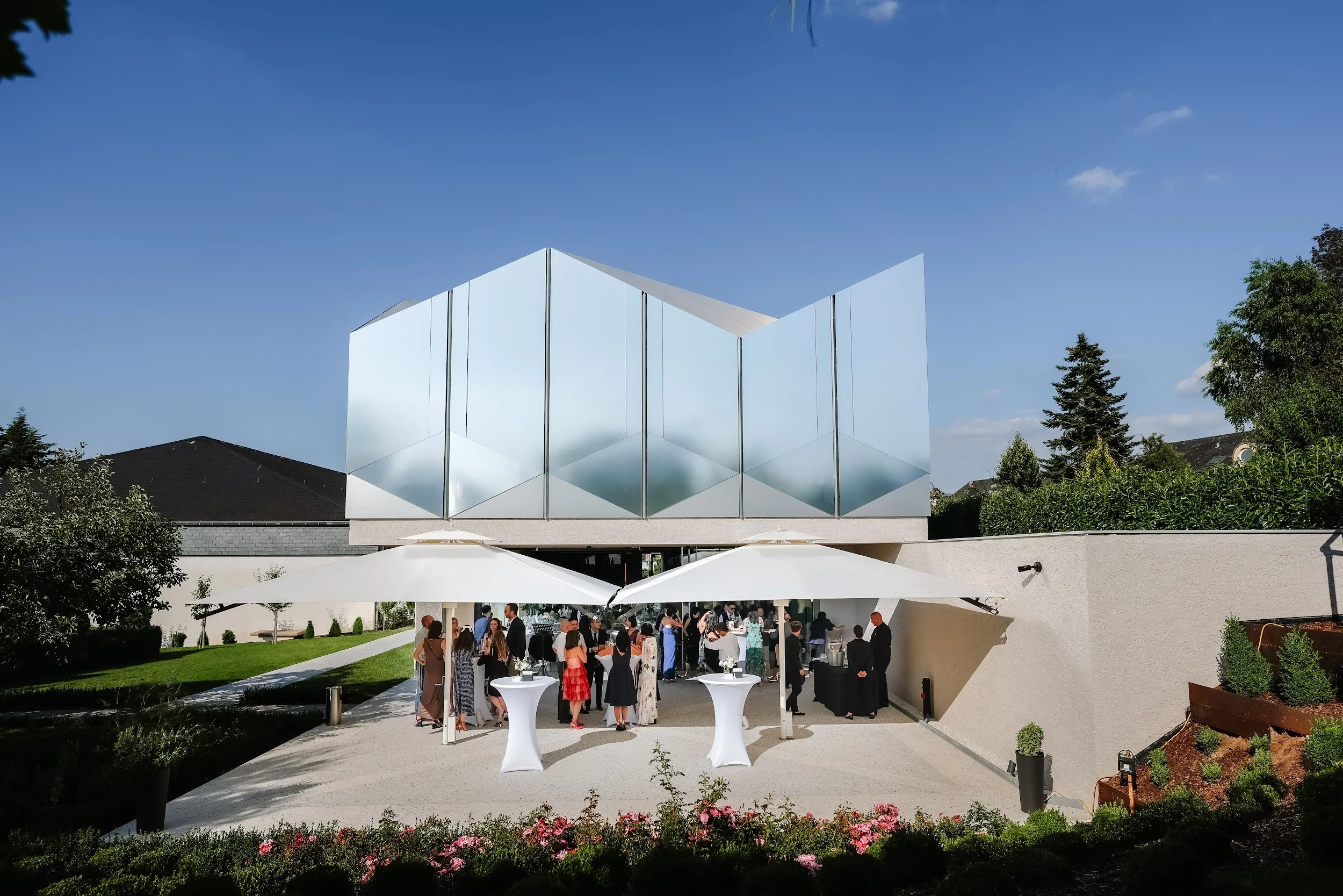 Inside the newly opened event room, a space that seamlessly combines wine, architecture, and nature, you'll find a luminous atmosphere perfect for weddings. With a seating capacity of 108 people, it's an oasis of peace and relaxation in the heart of the Domaine. Throughout your special day, you can savor high-quality wines and crémants from Domaine Claude Bentz.